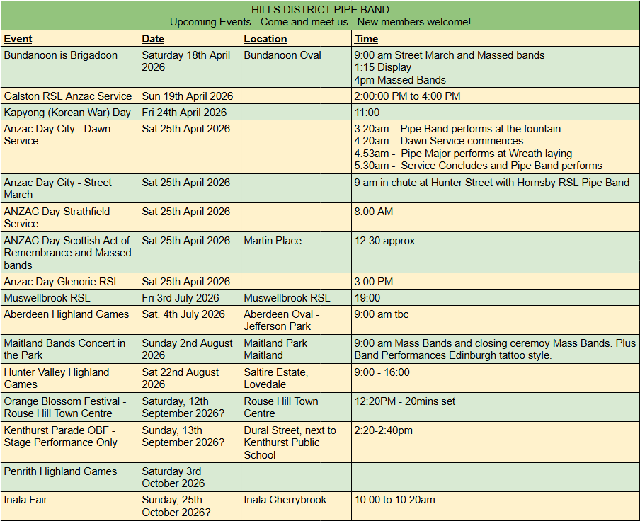 Hills District Pipe Band is the proud pipe band of the Hills District of Sydney Australia, where place names such as Baulkham Hills, Glenorie and Glenhaven recall the contribution of Scottish people and culture. We are serious about the quality of our music and presentation, with a down to earth and welcoming culture. Members come from as far as the Central Coast and the more southern suburbs of Sydney. We have a calendar ranging from ANZAC marches and services across Sydney, to Highland festivals in the Hunter Valley and Southern Highlands of NSW, to community events in the Hills District.